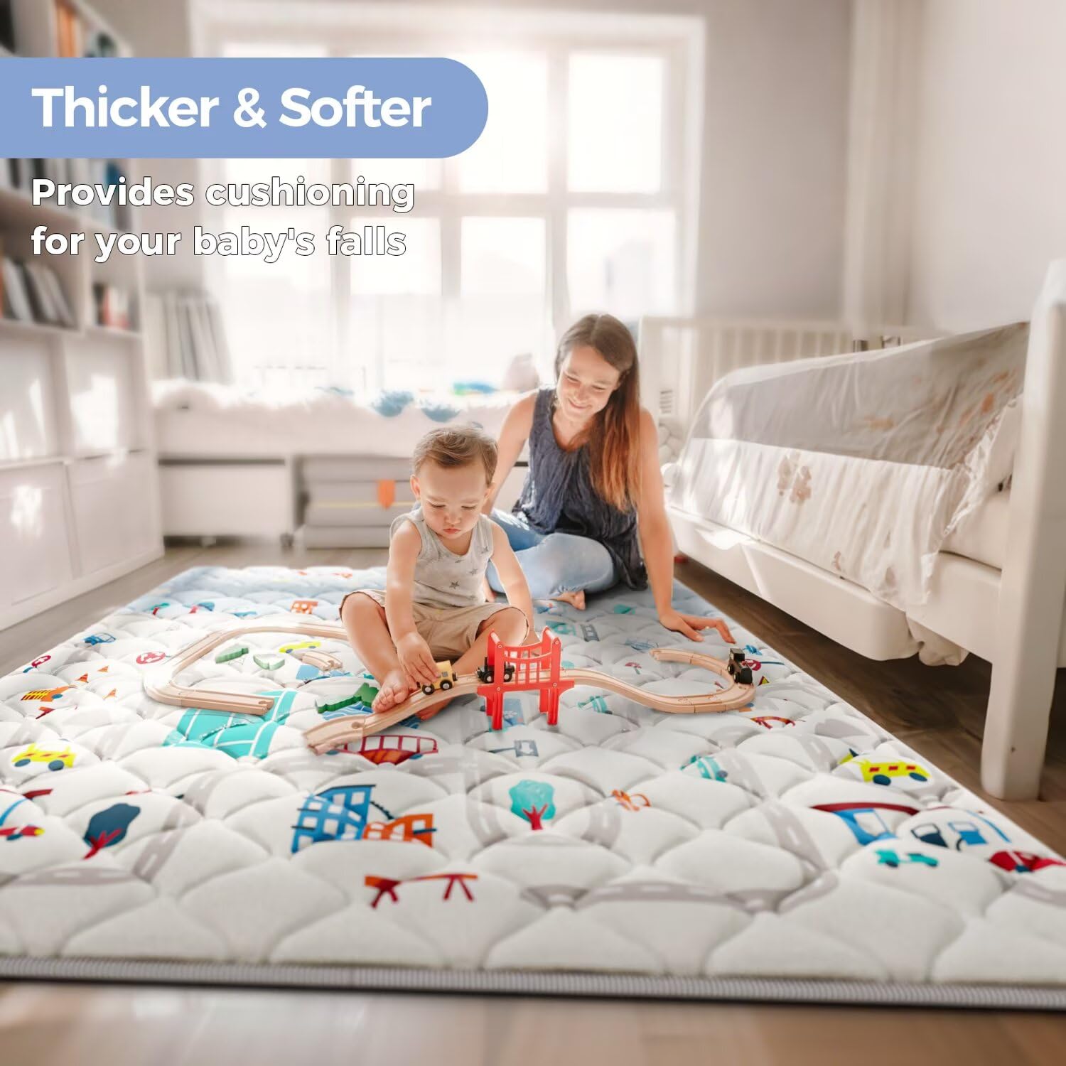 - 【Thicker Soft Premium Foam】Our baby play mats for floor is made of thick sponge and soft microfiber, which thicker than most other brand baby play mat. Upgraded thickened material foam play mat ensure a soft and cushioned surface, providing a comfortable place for your little one to relax, play and work on their developing skills