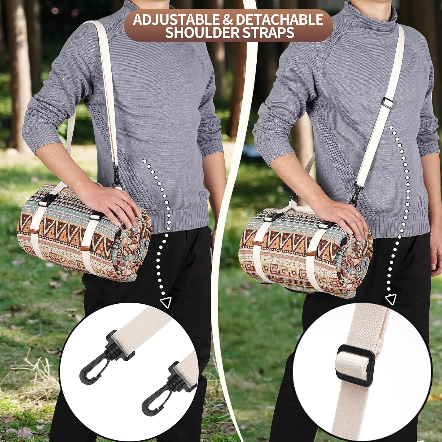 - ADJUSTABLE SHOULDER STRAPS - The portable picnic blanket can be carried easily by hand, on either shoulder by adjusting to the proper lengths, so you can carry other picnic suppliers with the other hand,the handle strap with double ring buckle is convenient to carry, and can easily fold and fix the picnic mat,so if you don't fold it exactly as originally packed, it will fit anyway,saving a lot of space on the travel.