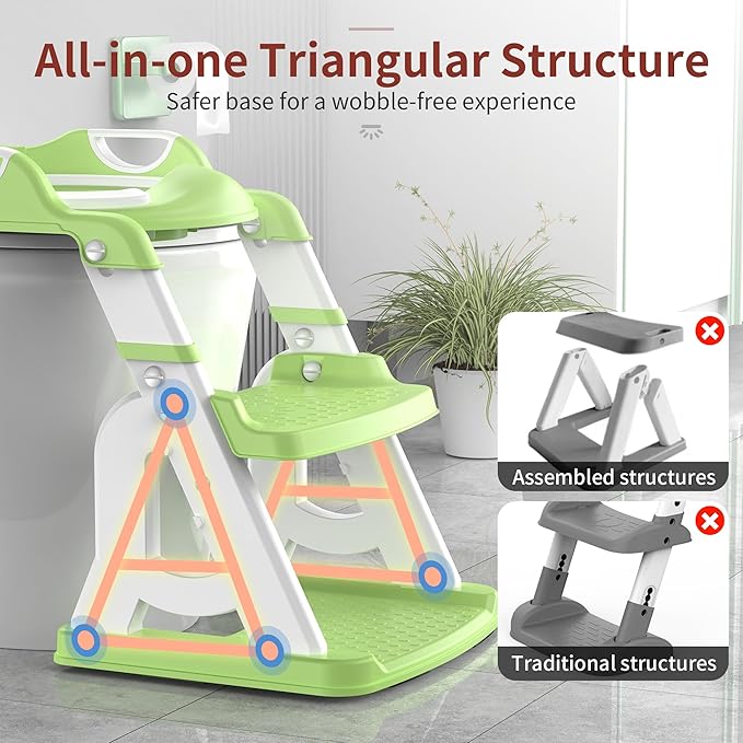 - 【Safer Triangular Structure】 MeuLife potty training seat features an exclusive integrated triangular structure, which offers superior stability compared to assembled triangular and traditional structures, effectively addressing common issues of seat wobbling. Coupled with a widened pedal measuring 15.7x7.1 inches, it completely alleviates children's fear of falling or climbing during potty training.