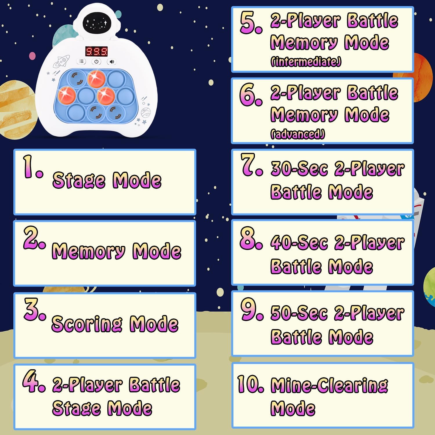 - Multi-Mode Interactive Game: Our handheld game console, the Speed Push Pop, offers four fun game modes - stage mode, memory mode, scoring mode, and multiplayer mode. Each mode provides a unique way to play and enjoy the game, and the console's unique shape design makes it an excellent puzzle game and decompression tool for both children and adults.