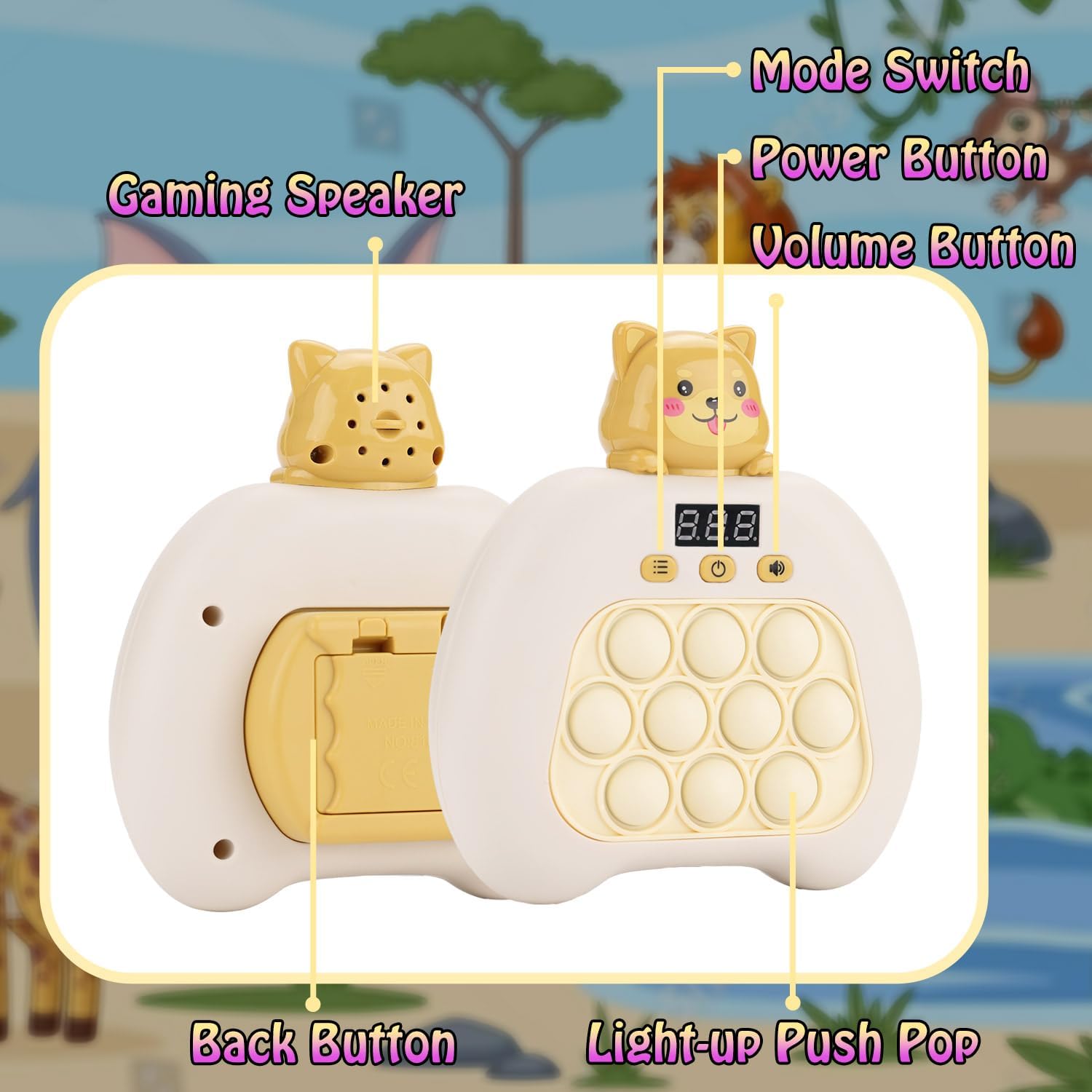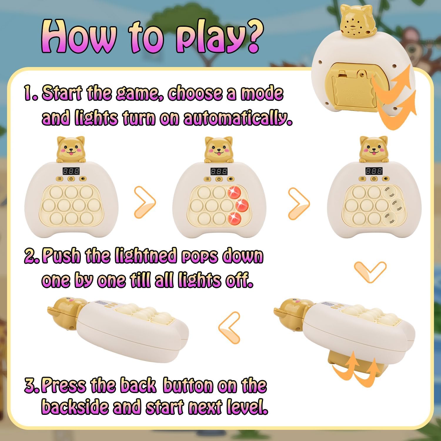 - Minimalistic Design: Features only four buttons - sound, power, switch mode, and the whole raised button on the back is the confirmation button. The game pop is equipped with a sensor device, and players just need to turn off the lights in succession by pushing the pops, and then press the confirmation button on the backside. The operation is simple, easy to learn, and perfect for all ages.