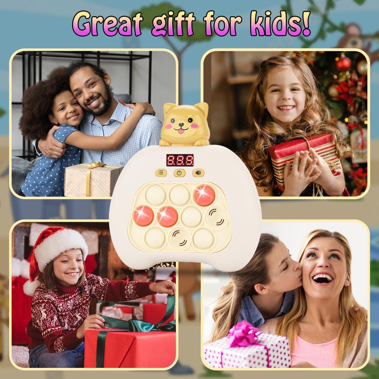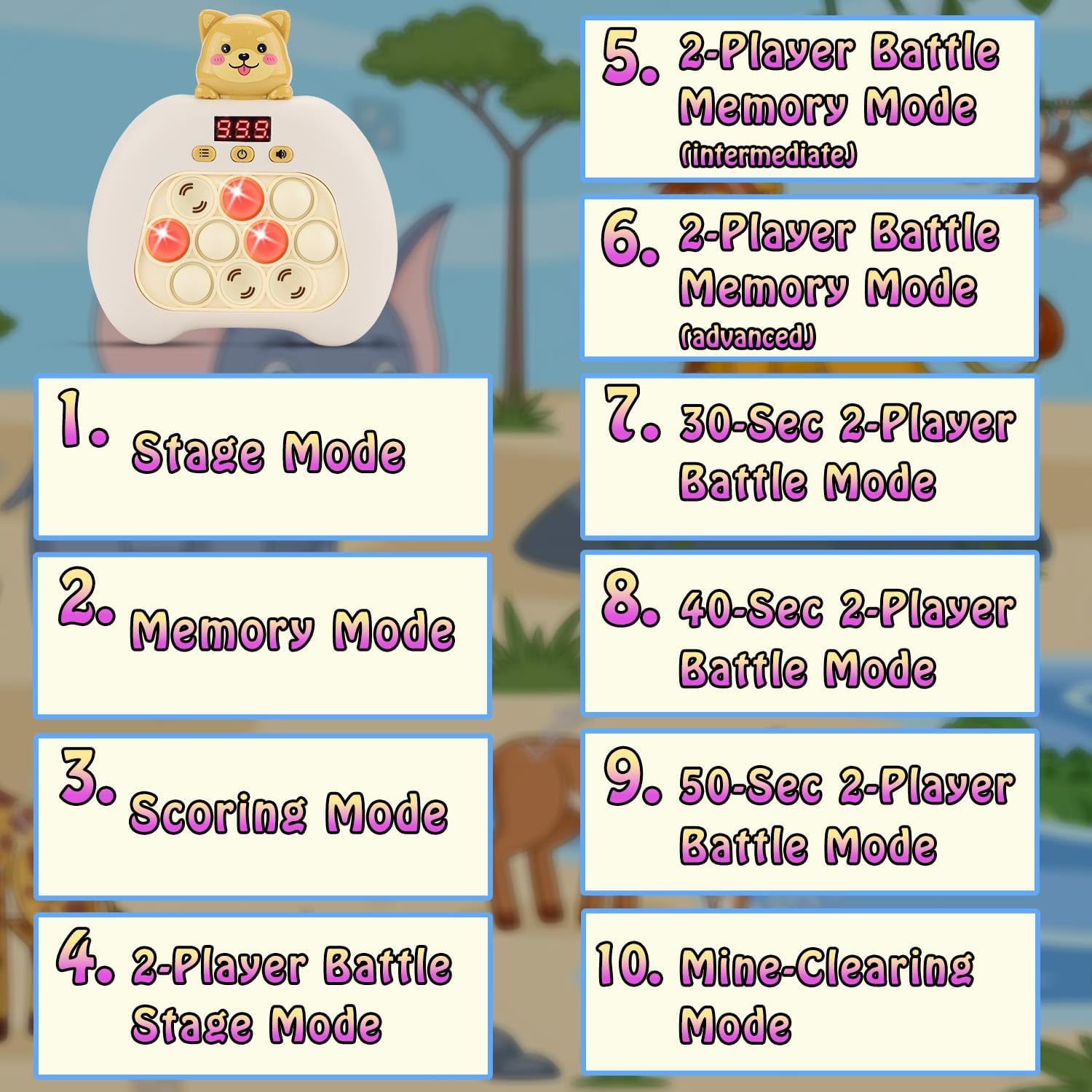 - Multi-Mode Interactive Game: Our handheld game console, the Speed Push Pop, offers four fun game modes - stage mode, memory mode, scoring mode, and multiplayer mode. Each mode provides a unique way to play and enjoy the game, and the console's unique shape design makes it an excellent puzzle game and decompression tool for both children and adults.