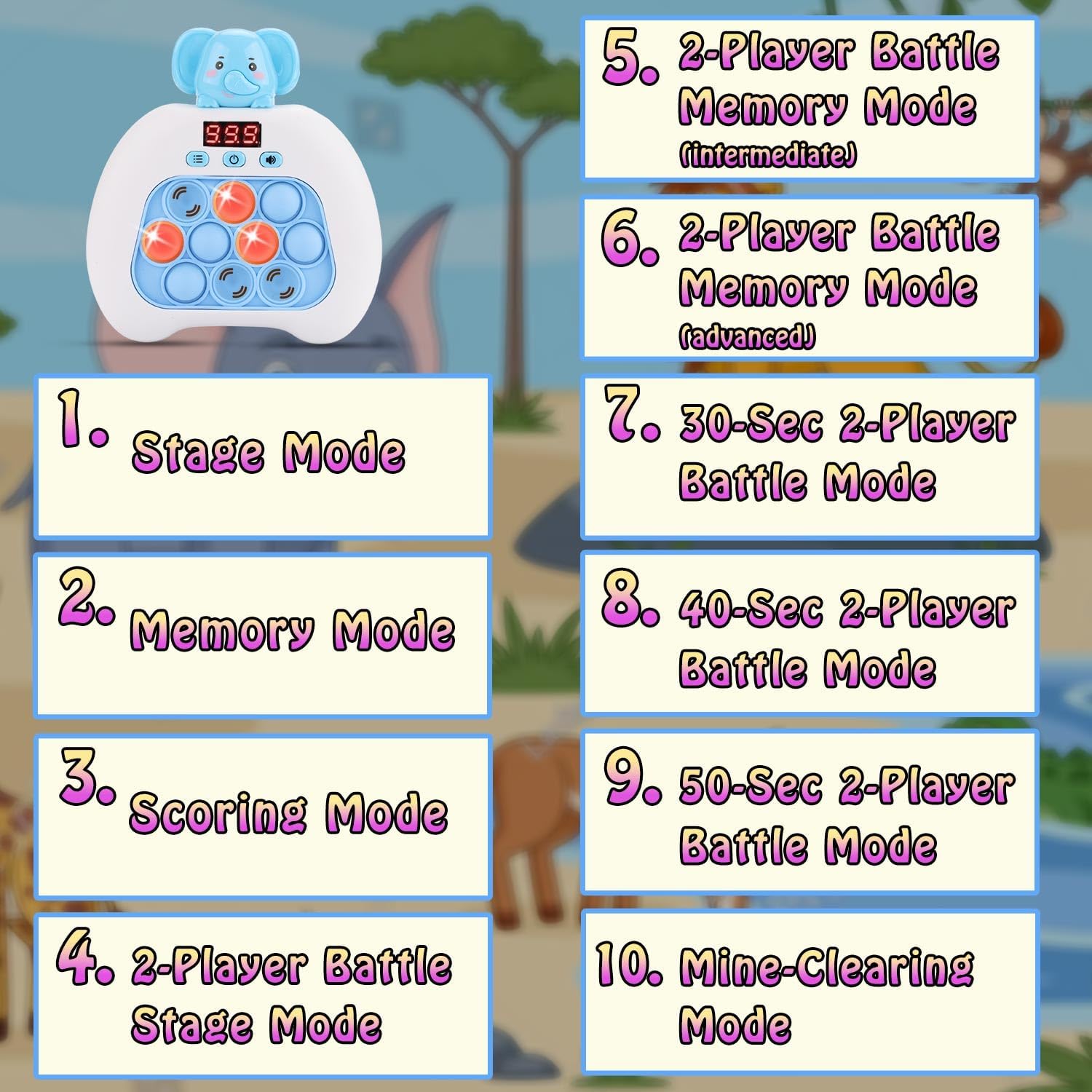 - Multi-Mode Interactive Game: Our handheld game console, the Speed Push Pop, offers four fun game modes - stage mode, memory mode, scoring mode, and multiplayer mode. Each mode provides a unique way to play and enjoy the game, and the console's unique shape design makes it an excellent puzzle game and decompression tool for both children and adults.