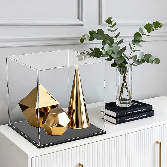 10 Inch Clear Acrylic Display Case, Cube Acrylic Box for Collectibles Showcase, Plexiglass Case with Matt Black Stand for Toys, Arts and Figures