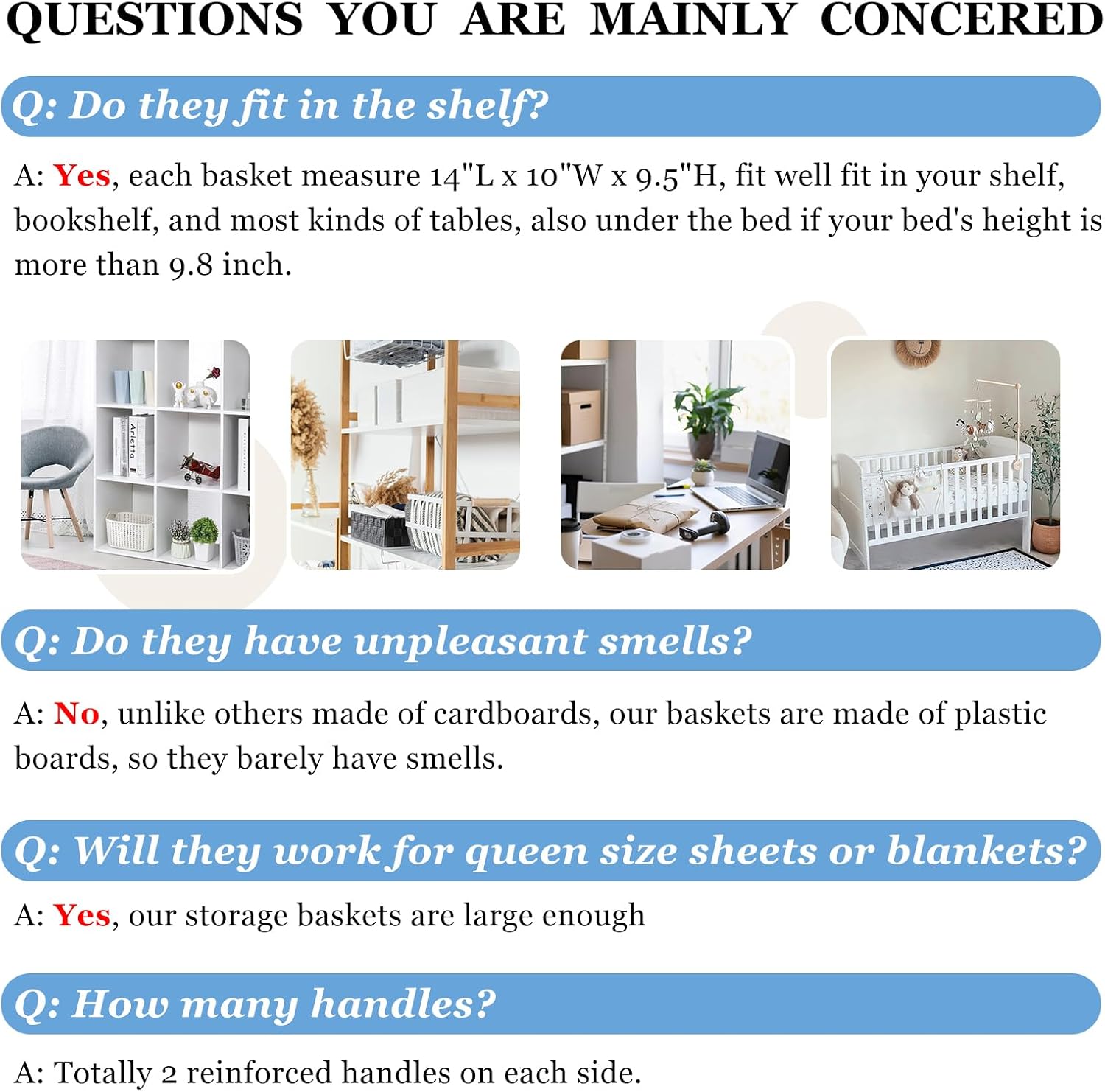 - 【PREMIUM QUALITY】 These bins for organization are made of stiff plastic boards on all sides and bottom, so these storage cubes could remain sturdy for years, stackable, and odorless in enclosed space. Durable non-woven fabric ensures these organizer baskets long-lasting. The organizer bin is stitched with 2 handles for a firm grip and easy carrying.