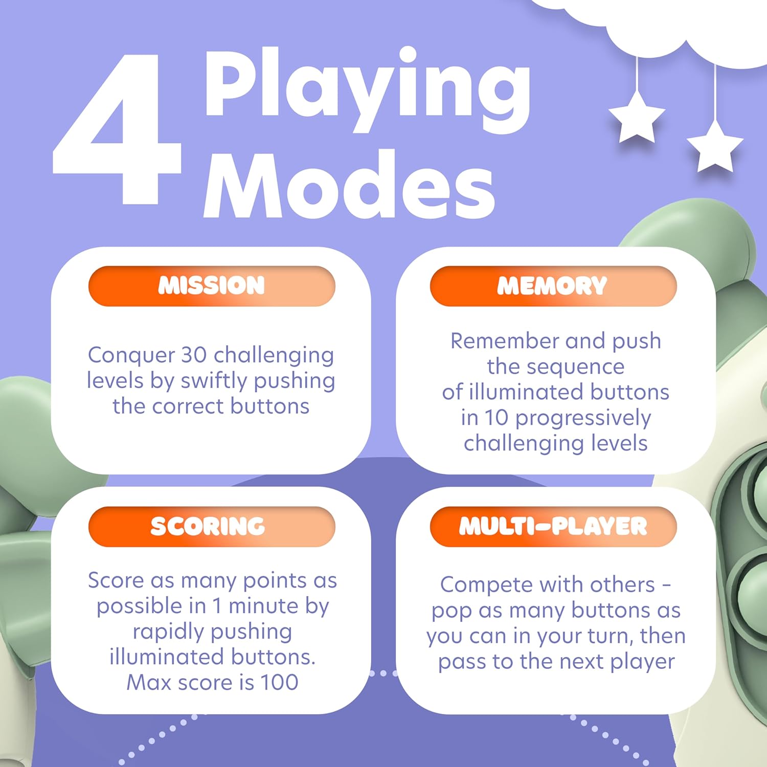 - 4 engaging game modes: the handheld game console from Chago featuring mission, memory, scoring, and multiplayer modes, ensures an elevated and addictive fidget game experience for kids and adults