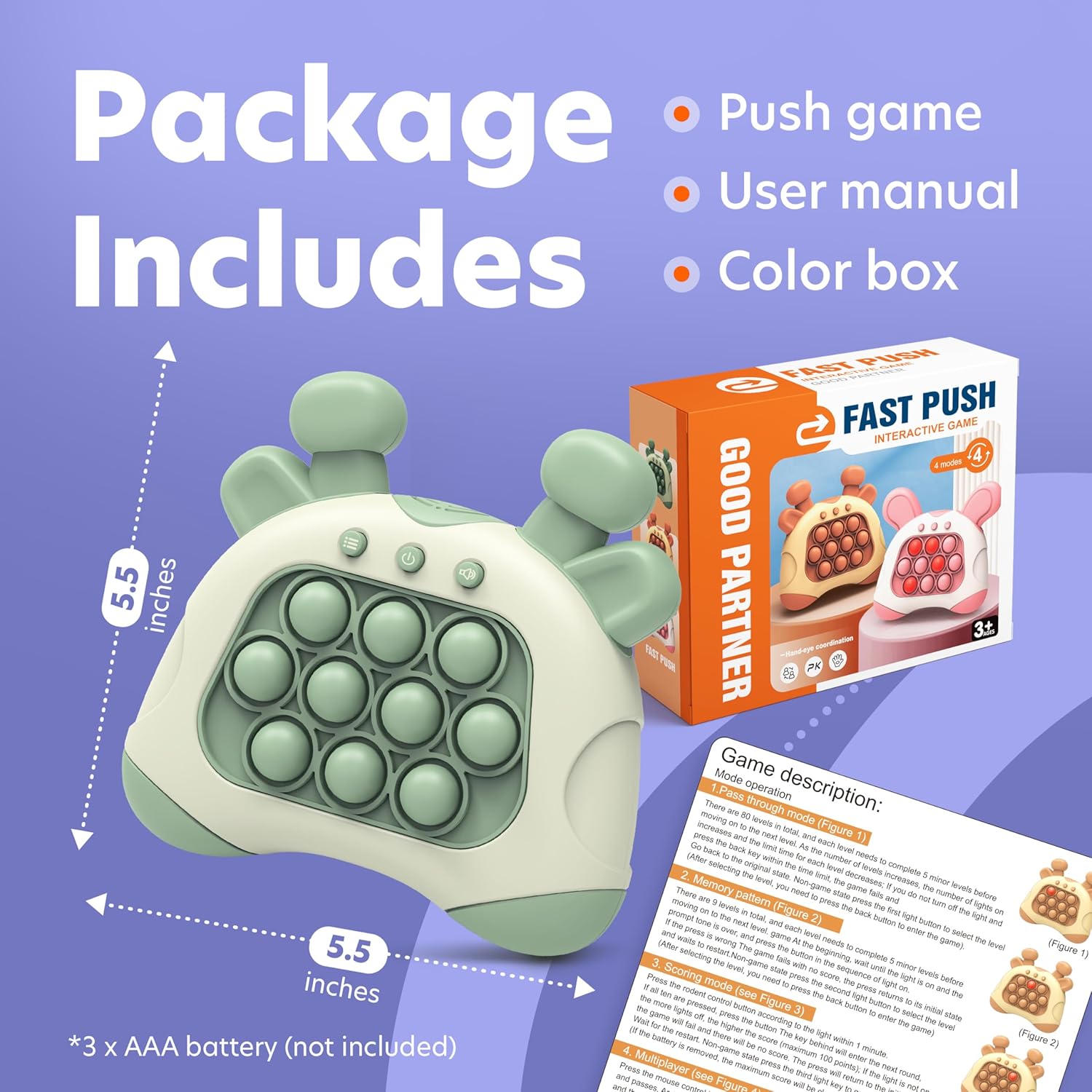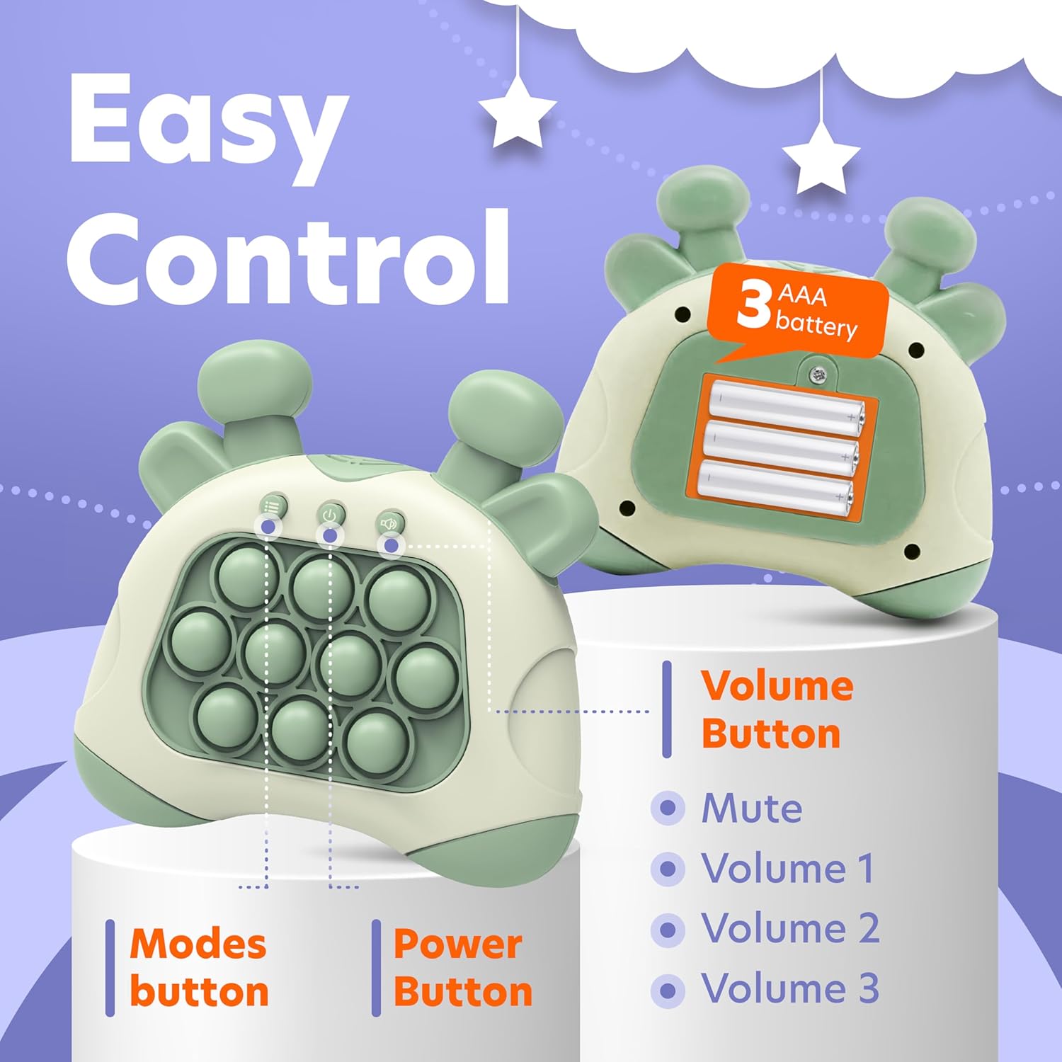 - Easy to use: switch mode, volume, and power – three buttons featuring our fast push bubble game, also equipped with the rush popper user manual for easy involveness and hassle-free gaming experience; powered by 3 AAA battaries (not included)