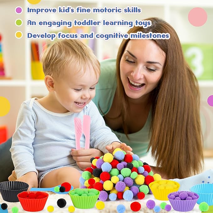 - What You Get: 6 x sorting bowls(red,blue,yellow,green,black,purple), 1 x tweezers(pink), 1 x spoon(blue), 150 x pompoms(red, blue, green, yellow, black, purple)