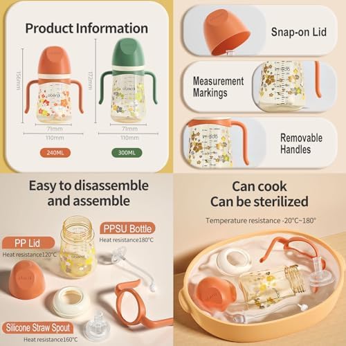 - ★PPSU Safe Material: The sippy cup is made of Polyphenylsulfone(PPSU) with heat resistance, excellent durability and high transparency, Which is light yellow with BPA and BPS free; Compared with the bottle made of PP, the PPSU sippy cup is much more sturdy and can withstand higher temperatures.