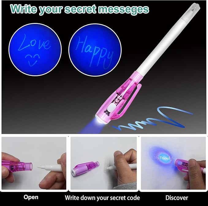 - 【SAFE INVISIBLE INK PEN】- It is a very magic and funny invisible ink pen with double end! Kids loves to hide their messages on the notebooks with invisible pen, their secret only shown when shinning with the magic light on top. They also can write the daily diary with the blue ink ballpoint too. This invisible pen ink is washable and harmless