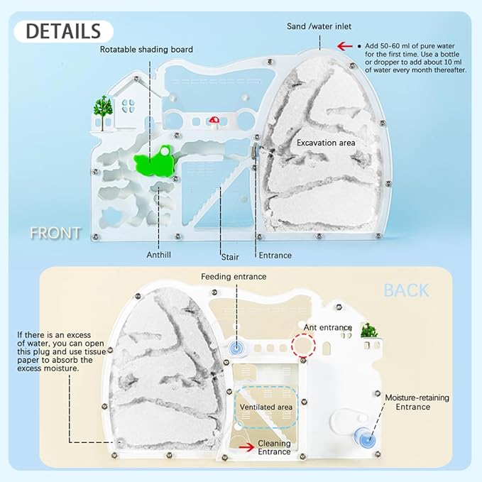 - 【Easy to Use】The ant farm is easy to set up and use, making it an ideal choice for beginners. Our ant castles are designed with unique holes that makes easier for loading ants into the container and feeding them with food and water.Water Tips : Add 50-60 ml of pure water for the first time . Use a bottle or dropper to add about 10 ml of water every month thereafter. The water is used to maintain humidity and prevent the sand from drying out.