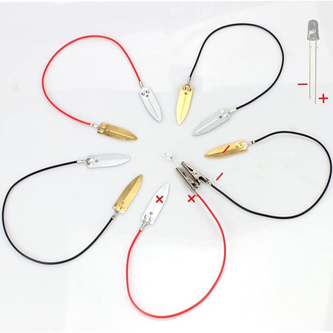 - PACKAGING INCLUDES: You will get 5 sets fruit battery science experiment kit, which include 20 pieces of copper sheets, 20 pieces of zinc sheets, 5 pieces of electronic clocks, 10 pieces of RGB LED, 20 pieces of wires, 10 pieces wires with clip, 5 whole sets for you to apply