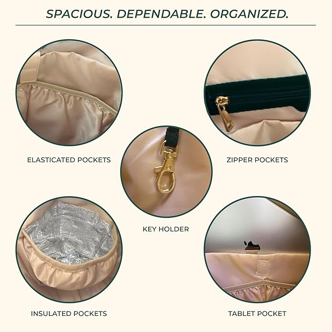 - EASY ORGANIZATION – This bag features one spacious main compartment and a total of 12 pockets. The 7 inner pockets include 2 zipper pockets, 2 insulated pockets for keeping bottles warm or cold, 2 elasticated pockets, and 1 tablet pocket. On the outside, there are 2 large zipper pockets, 2 side pockets for bottles, and 1 back pocket for quick access or strapping onto a suitcase.
