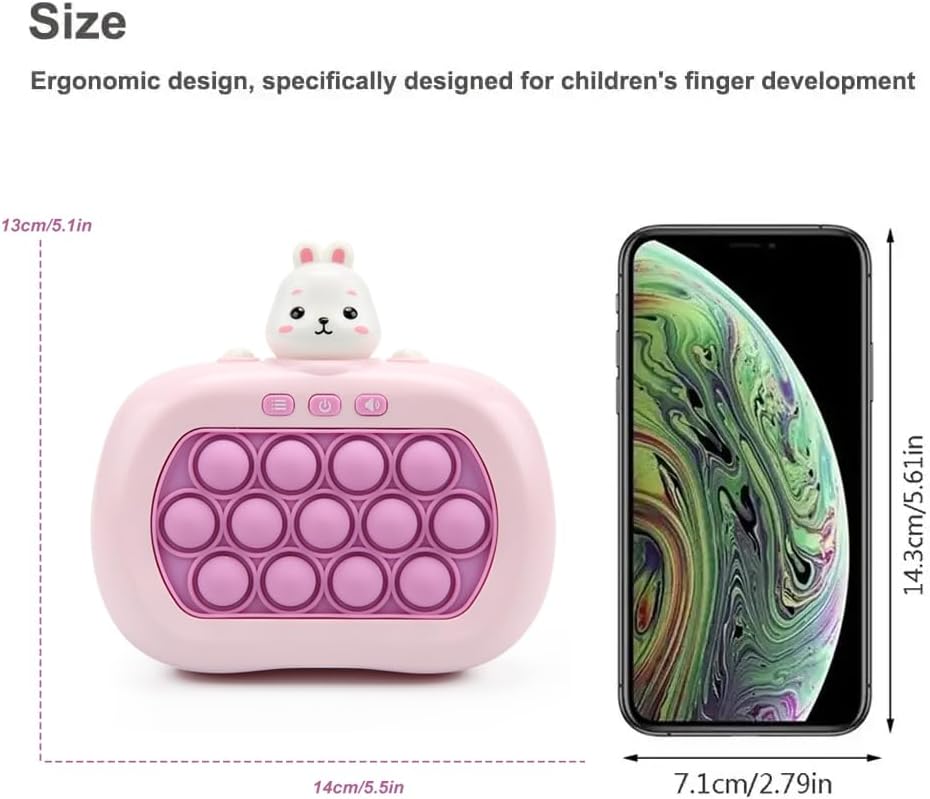 - 【Safe and Durable】The pop fidget toy is made of high-quality silicone and plastic, which is sensitive to the touch, just gently press the bubbles, not easy to damage, and is safe, and durable. The non-slip handle, compact and lightweight, and ergonomic design allow kids to enjoy the game anytime, anywhere, helping them away from phones and tablets, and effectively reducing screen time. Note: The game console needs 3 AAA batteries to be used (the product does not include batteries)