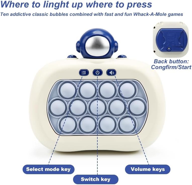 - 【2024 Upgraded Puzzle Speed Push Game】This puzzle game machine combines the classic bubble pressing game and the whack-a-mole game that tests speed and eyesight. Quickly press the lighted bubble to break through the level. The upgraded version of the plush toy is more challenging, which can effectively help children exercise their thinking and accompany their intellectual growth.