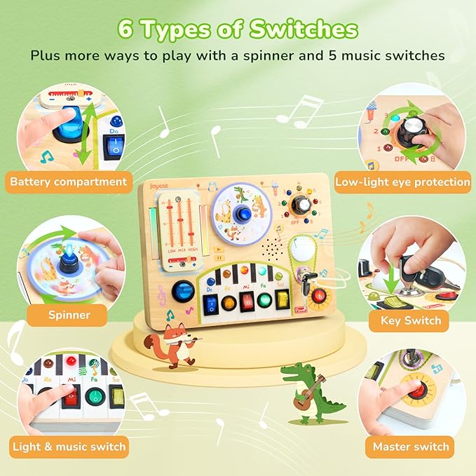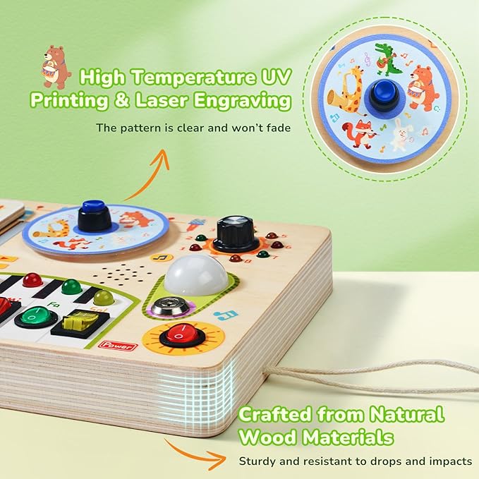 - Interactive Wooden Switch Board: Designed for toddlers who love switches and LED lights, this toddler busy board features different switches, each linked to a unique LED. The brightness is perfectly adjusted to be comfortable for young eyes, not too bright or dim