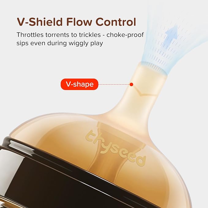 - V-VALVE DESIGN: Automatic opening, easy sip, effortless flow. Size varies with suction, self-adjustable flow, smooth sips, choke-free trips. No spray, no leak! Learning to drink should be fun, not messy. Spill-proof soft spout is gentle on teeth and gums.