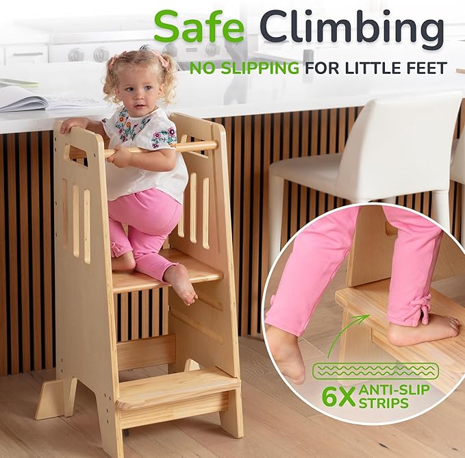 - MONTESSORI-INSPIRED FOR EARLY INDEPENDENCE – Supports up to 150 lbs and fosters self-confidence through hands-on learning. Designed to help children safely take part in everyday routines, building real-world skills the Montessori way from an early age.