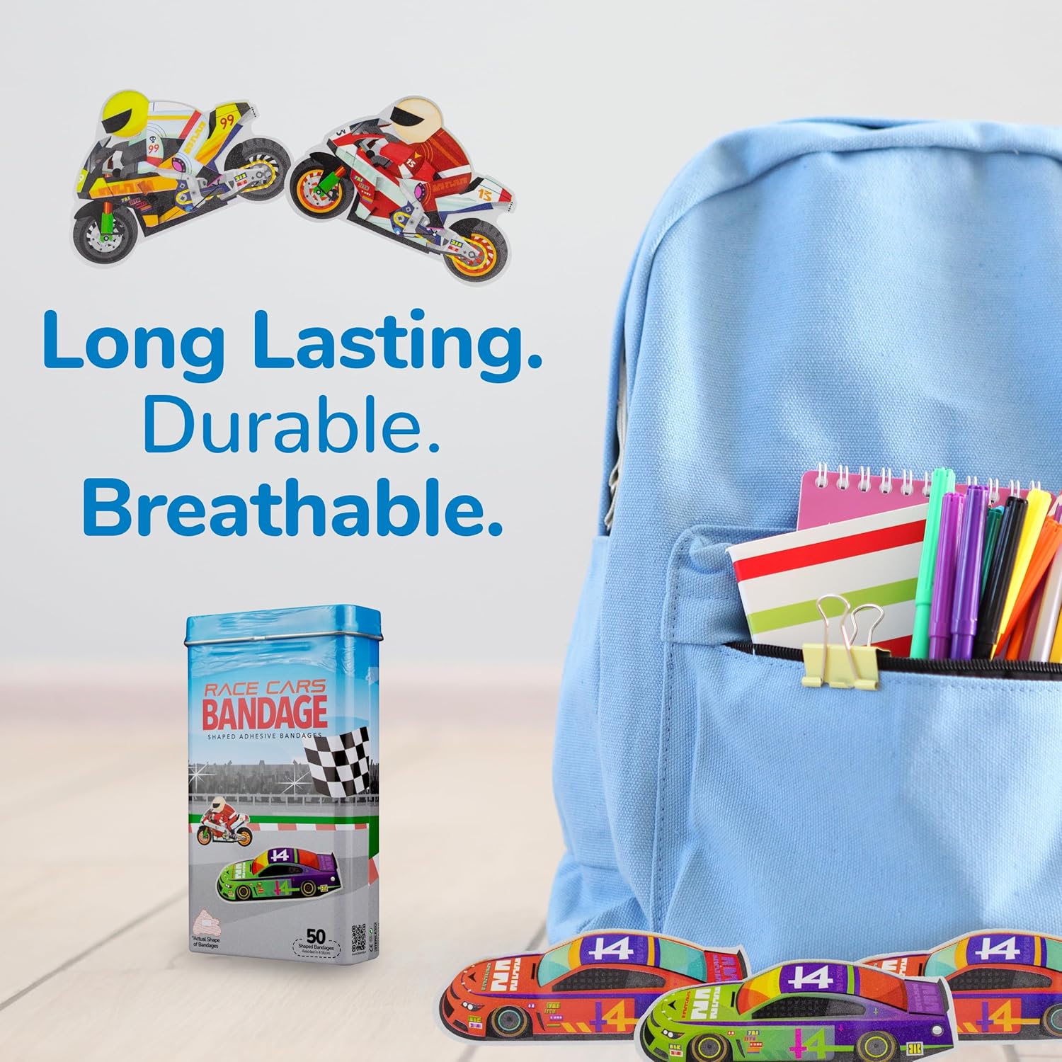 - RACE CAR BANDAGES: This 50 piece tin of Race Cars bandages feature 4 fun assorted race car and motorcycle shapes, and is great for putting a smile on kids' faces while protecting wounds such as cuts, scrapes, and burns; great for an epic first aid adventure, these sticky bandages come in a cute cardboard box and are perfect for kids and adults alike, and also for school nurses and pediatric doctors