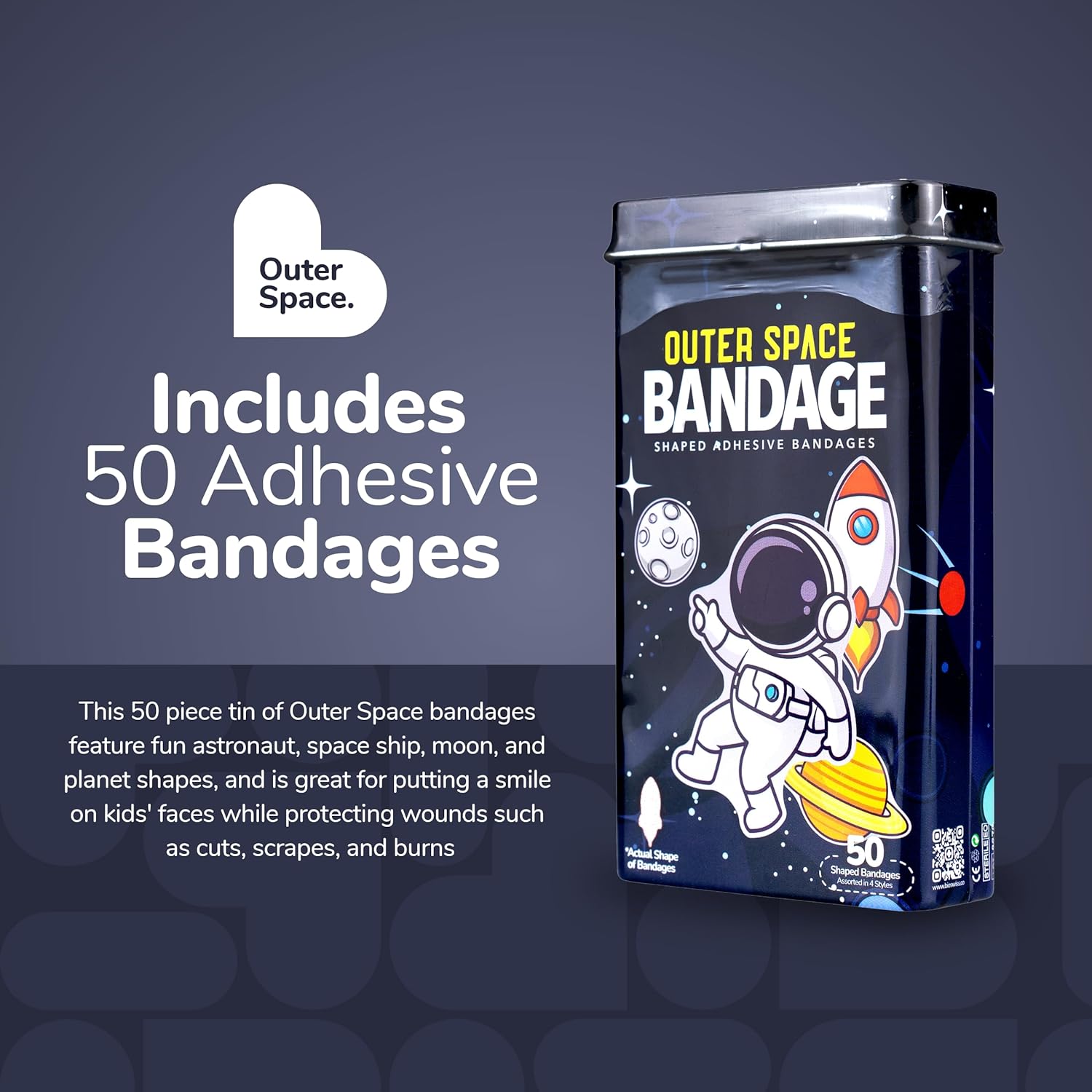 - OUTER SPACE BANDAGES: This 50 piece tin of Outer Space bandages feature fun astronaut, space ship, moon, and planet shapes, and is great for putting a smile on kids' faces while protecting wounds such as cuts, scrapes, and burns; sticky bandages come in a cute cardboard box and are perfect for kids and adults alike, and also for school nurses and pediatric doctors