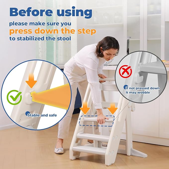 - Space-Saving Foldable Design: Folding toddler step stool, just 3 steps to fold it up when not in use. Perfect for kitchens, bathrooms, or playrooms without taking up much space.