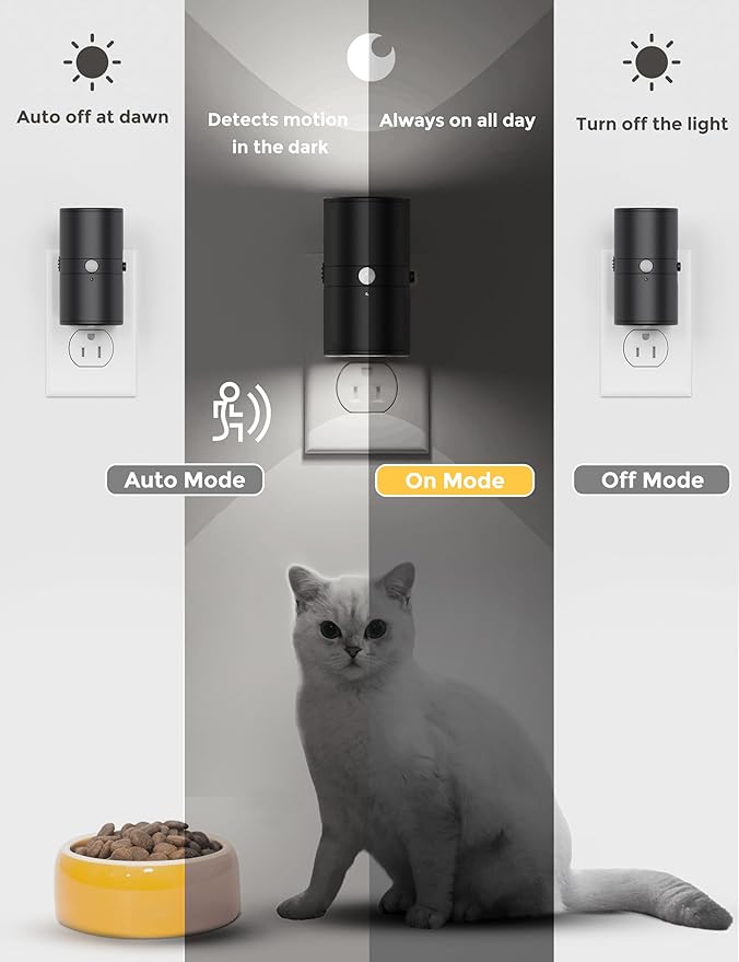 - 3 Lighting Modes: The plug in night light has a built-in motion sensor and 3 lighting modes. "On" mode - always on; "Off" mode - turns off the light; "Auto" mode - automatically turns on when motion is detected in the dark (Sensing Range: 3-5M, 120°) and turns off after 60 seconds of inactivity.