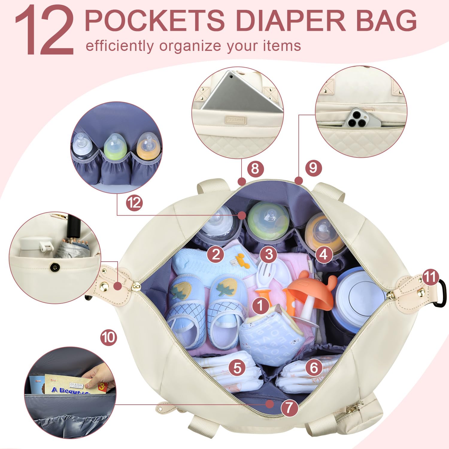 Diaper Tote - Diaper Bag with Pacifier Case, Shoulder Straps, Stroller Clips, Waterproof Mommy Bag for Mom and Dad, White