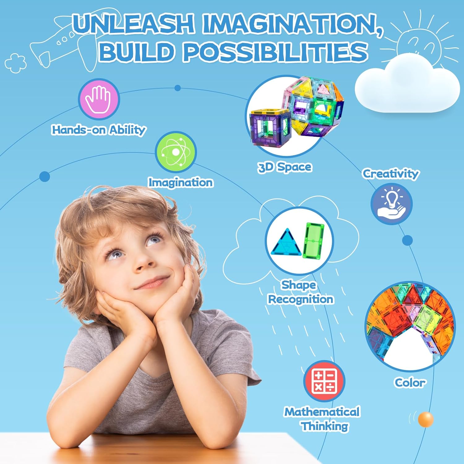 - Deluxe 130 PCS Magnet Tiles---EchoPlan Magnetic Blocks set offers 14 variety of shapes, perfect for DIY unique models. These vibrant, colorful magnetic tiles provide limitless building possibilities for both boys and toddlers. From 2D flat shapes to intricate 3D geometric structures, this sensory toy will ignite their imagination and creativity. As a STEM toy, it encourages exploration, design, and construction, offering endless opportunities for fun and learning.