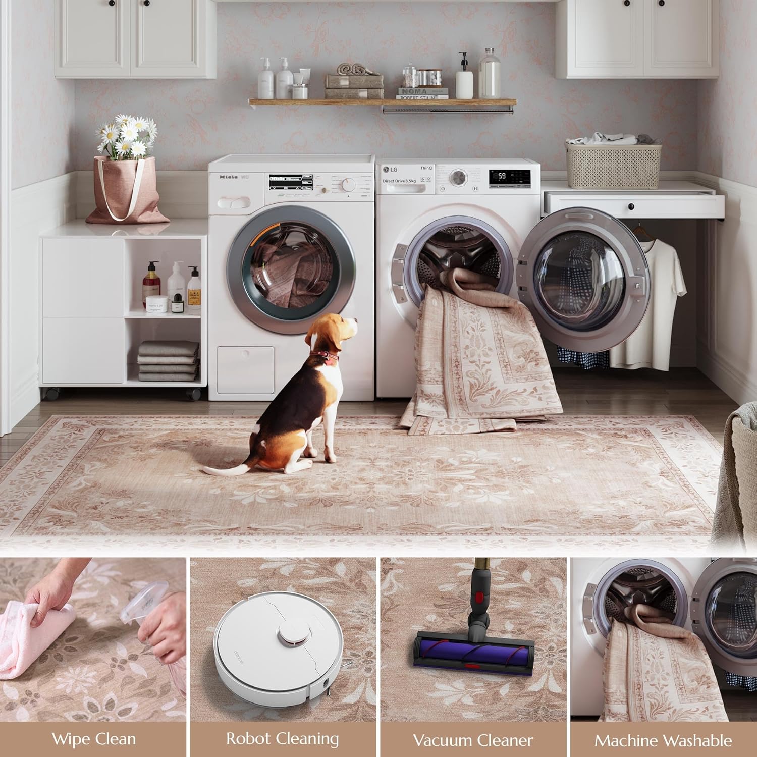 jinchan Vintage Floral 4x6 Area Rugs - Machine Washable Distressed Design Soft Ultra-Thin Low-Pile Non-Slip Carpet for Entryway Kitchen Bedroom Nursery Living Room Dining Room (4x6ft,Coral Pink)
