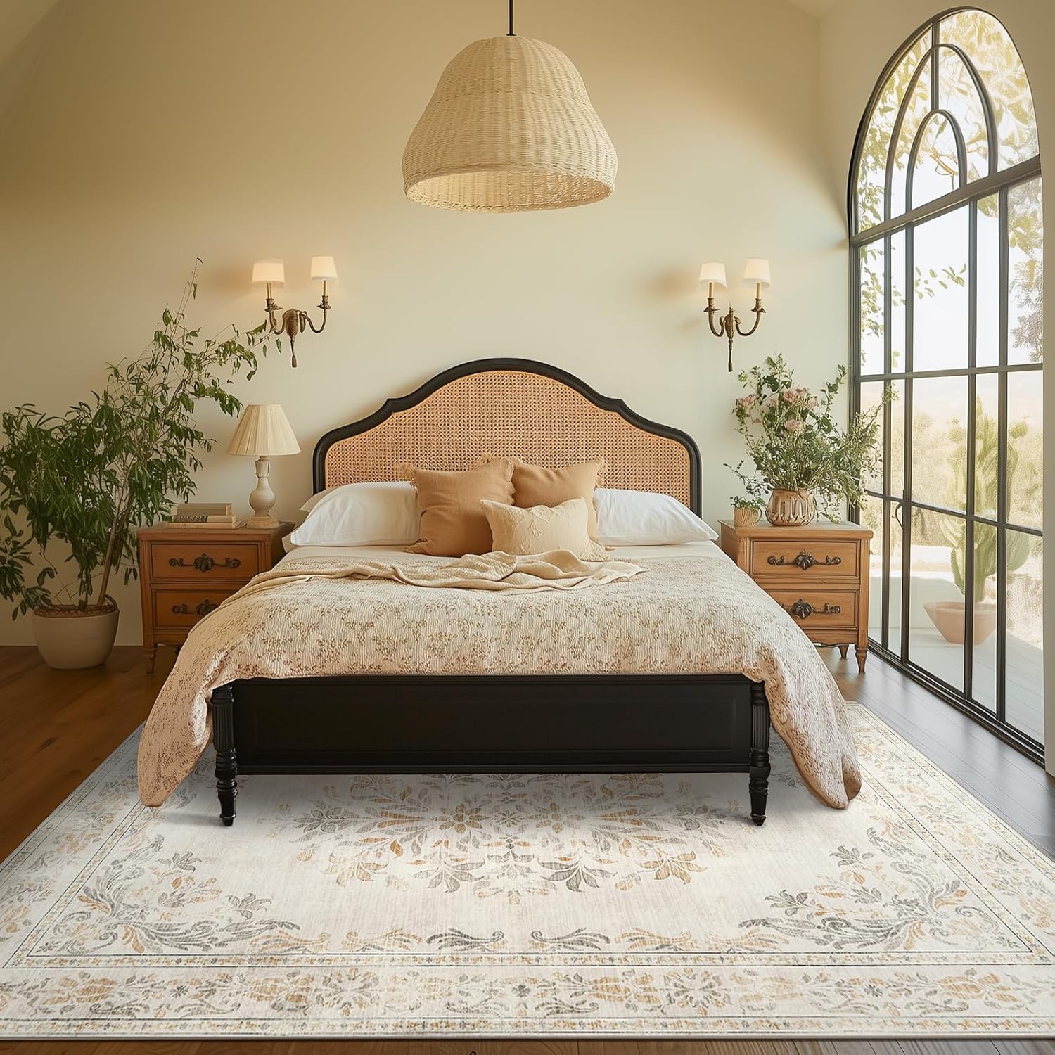 jinchan Vintage Floral 8x10 Area Rugs for Living Room - Machine Washable Distressed Design Soft Throw Rug Thin Non-Slip Large Carpet for Bedroom Nursery Dining Room Home Office (8x10ft,Light Grey)