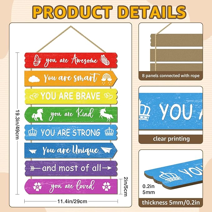 - Kids Room Decor: This rainbow wall decor sign is an ideal addition to kids' room decor. Each plaque features a different rainbow patterns, lets kids know about rainbow which are educational, and the 8 motivational warming words can help boost children's self-confidence