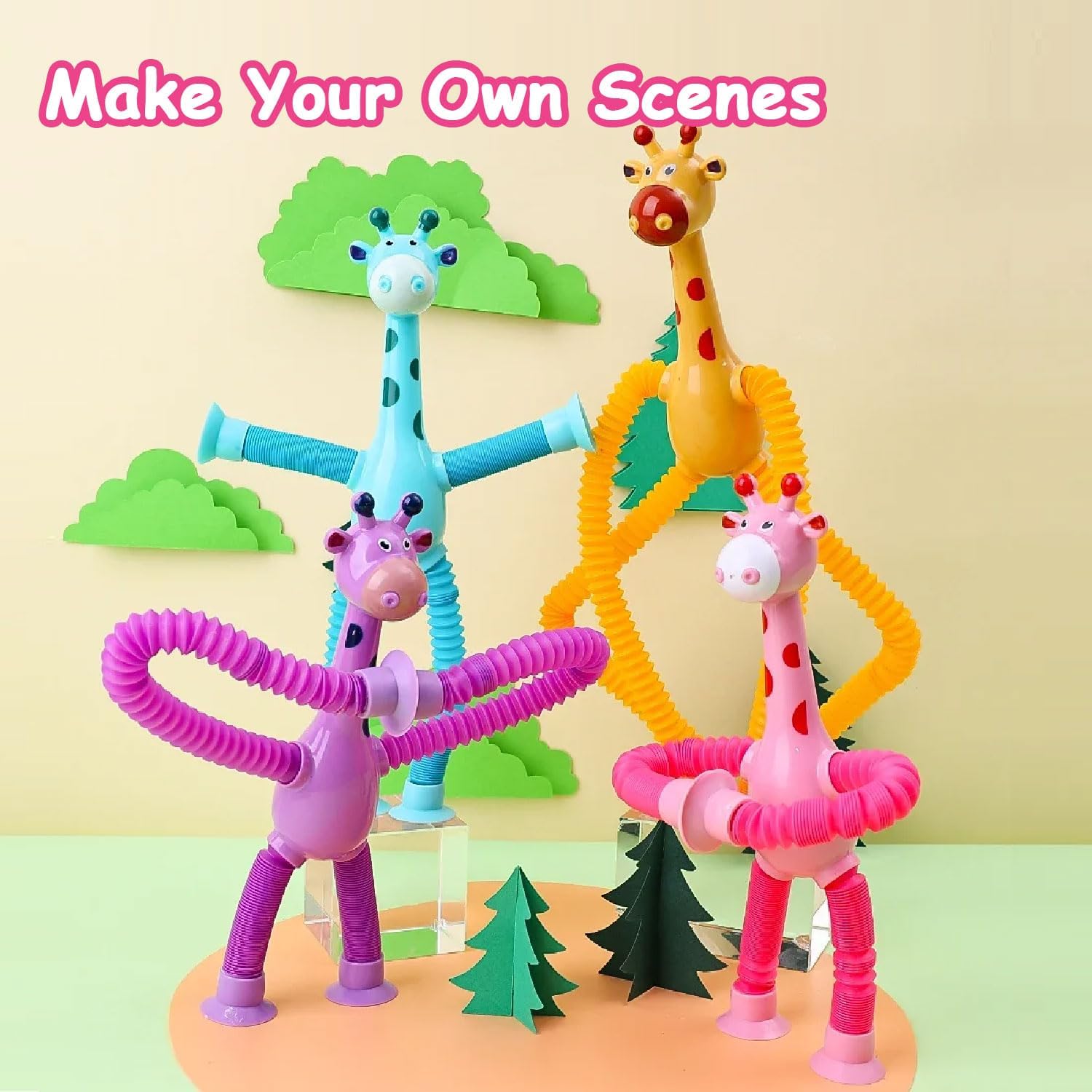 - CREATIVE IMAGINATION FOR KIDS: This telescopic suction cup Giraffe toy are innovatively designed with new pop tubes into limbs and uses suction cups as Aliens palms and soles of feet, which bring challenges and fun to toddlers fingers and brain. 4 different color combinations of giraffe toys can enrich kids' clolor cognition.