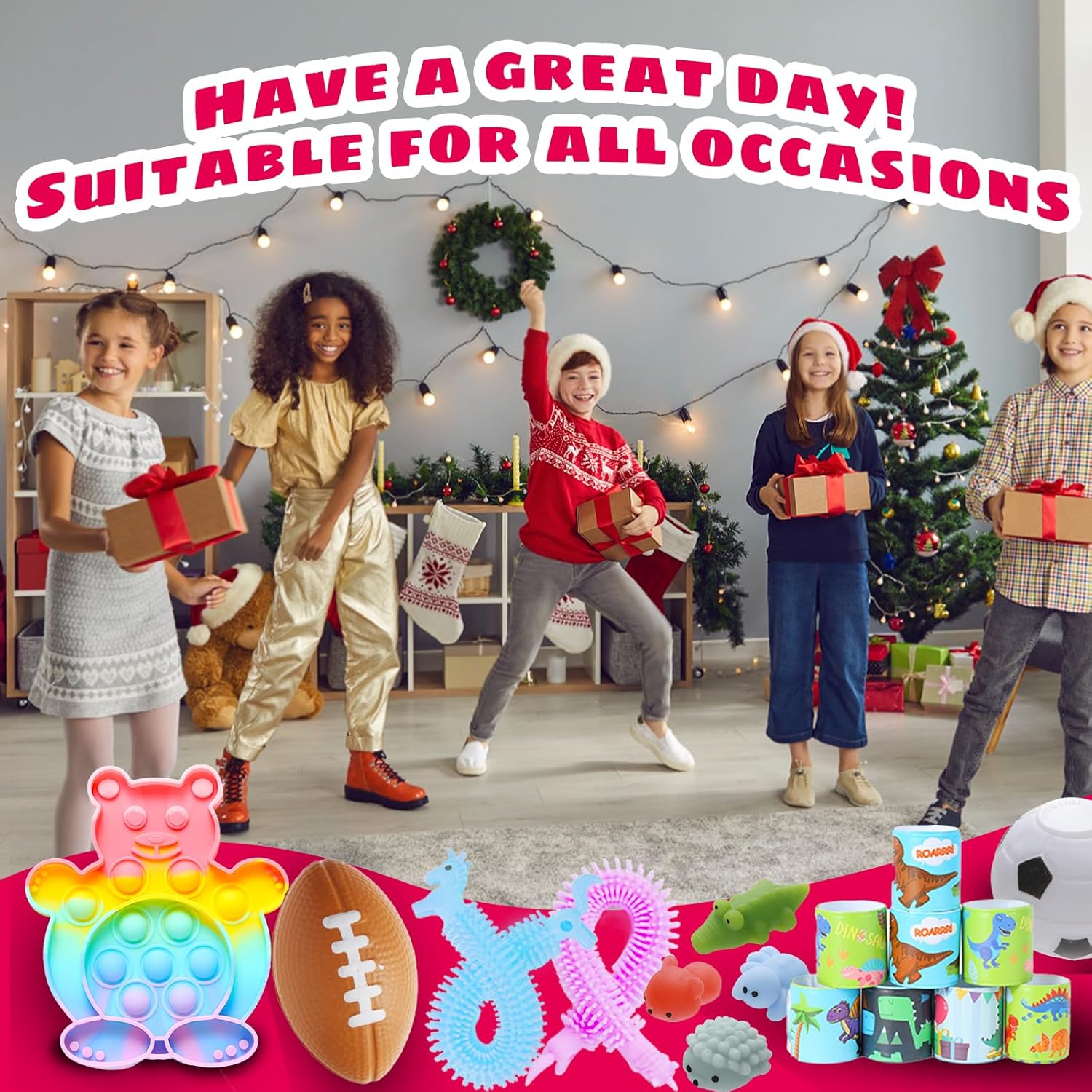 - PRODUCTS LIST: 3x fidget poppers are dog, elephant,bear,1x stress ball,4x mochi squishy,4x fidget keychain,4x sensory rings,2x sticky hands,5x spiky ball,5x fidget tubes,1x squishies ball,3x maze,4x slap bracelet,6x stretchy string,4x tumblers,2pack stickers,5x pull back car,1x fidget soccer ball,5x Mini dinosaur,1x building blocks toy,10x whistle toys,etc