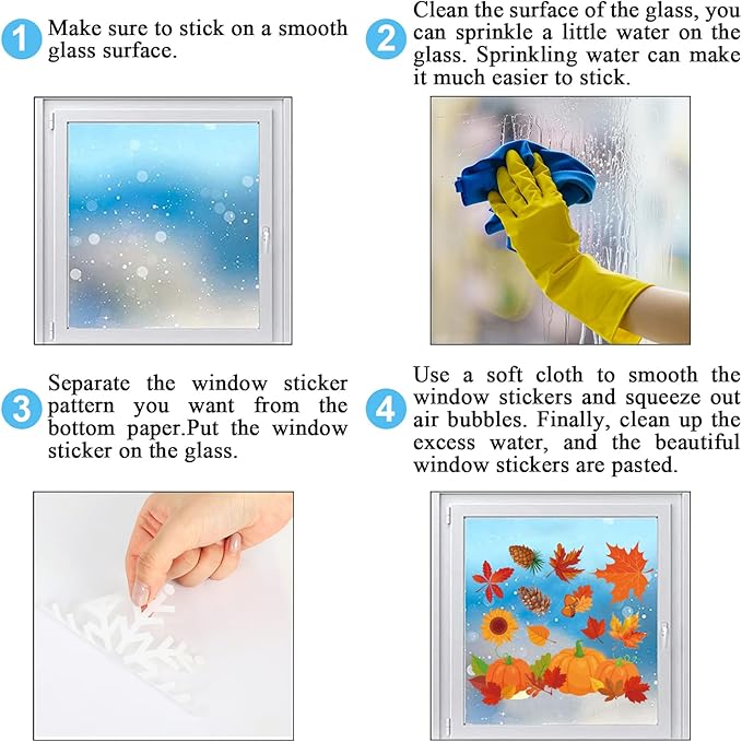 - Reliable Material - Our fall autumn window stickers are made of good-quality PVC material, safe and durable, waterproof and reusable, without any residue when you peel them off. When you’ gonna to use it, please ensure the window or floor is clean, and wipe the window with a wet towel or just spray some water to paste the decals correctly.