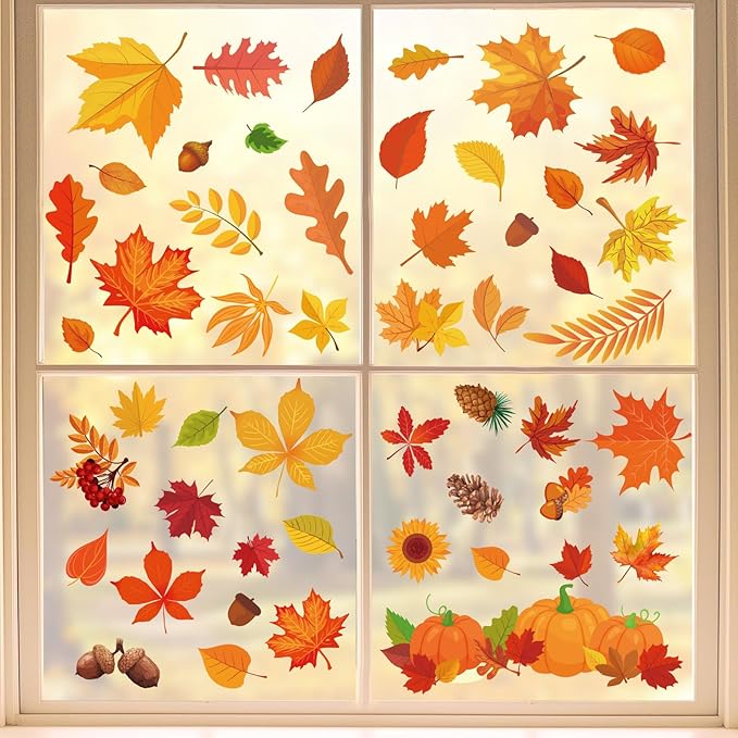 Whaline 124Pcs Fall Window Clings Colorful Maple Leaves Pumpkin Pine Reusable Window Decals for Autumn Thanksgiving Harvest Party Seasonal Holiday Home School Supplies