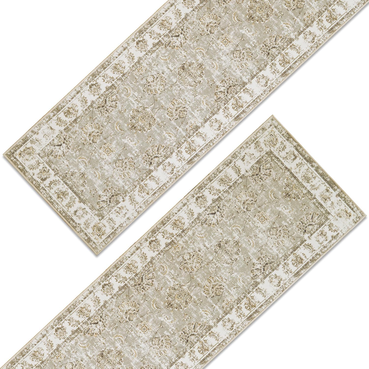 jinchan Runner Rug 3x8-2pcs Kitchen Washable Vintage Hallway Rug Floral Print Floor Cover Indoor Thin Retro Mat Accent for Bathroom Laundry Room Bedroom Office Farmhouse (Double,Taupe)