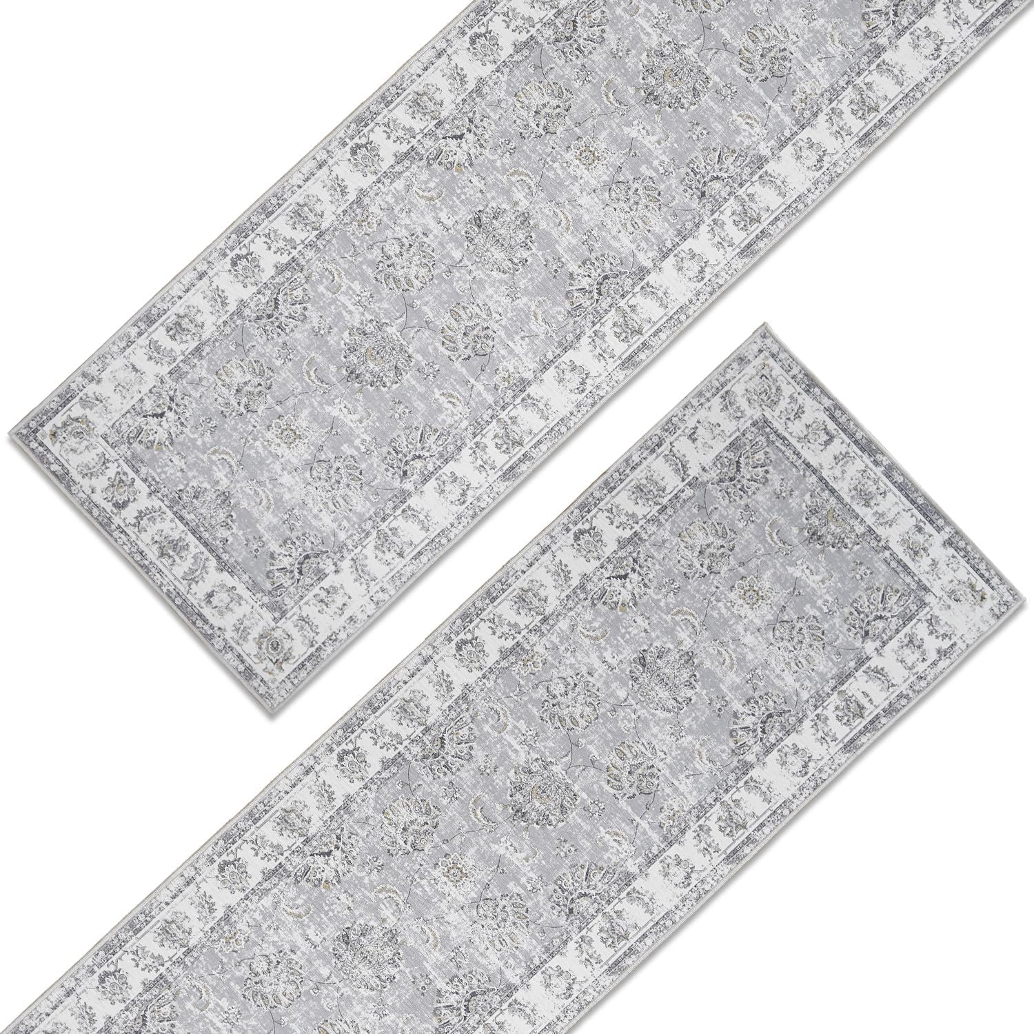 jinchan Runner Rug 3x10-2pcs Kitchen Washable Vintage Hallway Rug Floral Print Floor Cover Indoor Thin Retro Mat Accent for Bathroom Laundry Room Bedroom Office Farmhouse (Double,Grey)