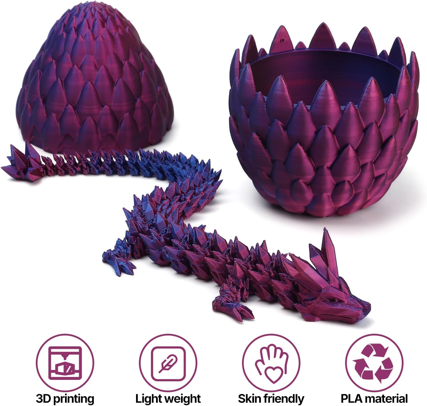 - Note:Multicolored dragons may vary in color pattern from photos due to the nature of the PLA filament when 3D printed. Includes a 12‘’articulated crystal dragon and a 5.5‘’dragon egg.