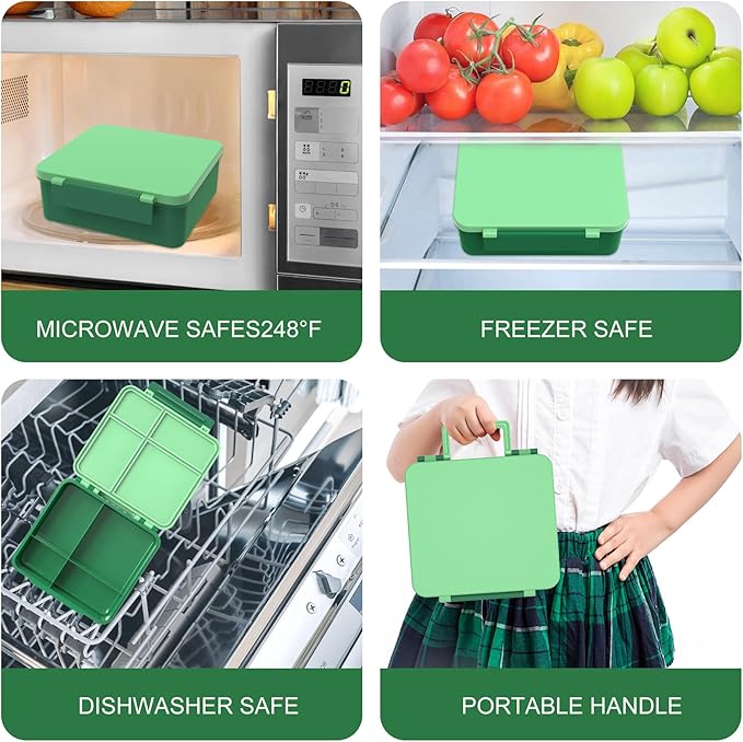 Bento Lunch Box with 8oz Soup Thermo, Kids Leakproof Lunch Food Containers with 4 Compartment, Kids Thermo Insulated Hot Food Jar for School, Trvael-Green