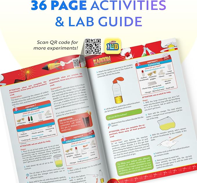 - LOADED WITH VALUE: Our educational science kit comes with 50+ KABOOM science experiments, from making balloon rockets from a chemical reaction, to creating their own fizzy bombs, to creating color explosions to exploding bags and much more!