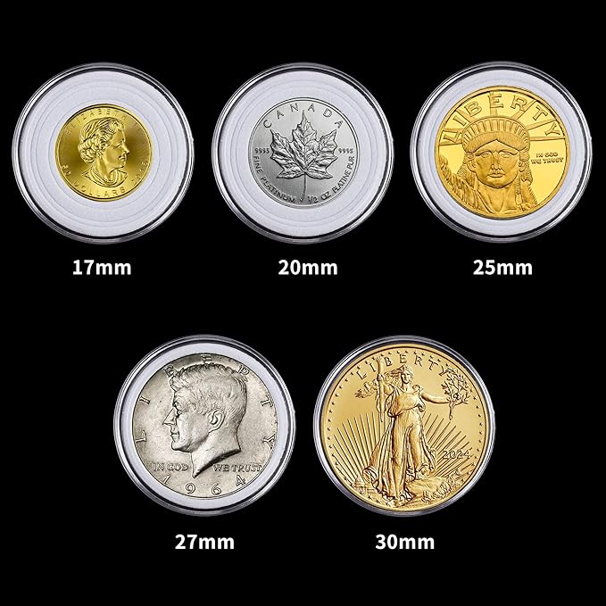 - OPTIMAL FIT AND PROTECTION - Equipped with 5 sizes of EVA foam gaskets (17/20/25/27/30mm), these coin cases provide a customized fit for most popular coins, including silver dollar coins, preventing sliding and scratching. Each coin holder has internal dimensions of 30x3 mm and external dimensions of 33x5.6 mm, perfect for securely housing coins, medallions, and badges up to 30mm in diameter. This snug fit protects your valuables from dust and damage, making these coin protectors ideal for all coins, including half dollar coin holders.