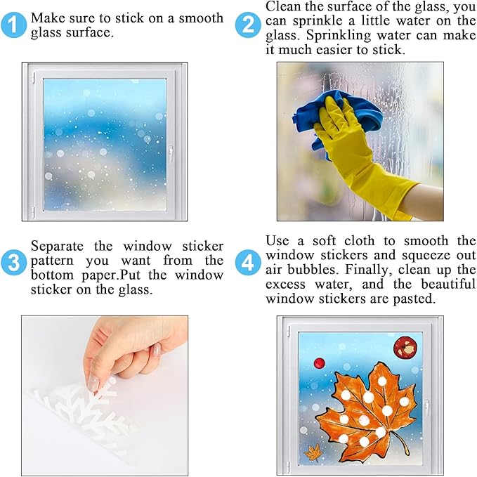 - Reliable Material - Our fall window stickers are made of good-quality PVC material, safe and durable, waterproof and reusable, without any residue when you peel them off. When you’ gonna to use it, please ensure the window or floor is clean, and wipe the window with a wet towel or just spray some water to paste the decals correctly.