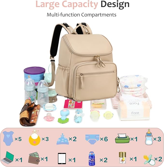 Large Capacity Diaper Bag Backpack with Stroller Buckle, Water-Resistant Travel Baby Bag with Insulated Pockets (Classic, Beige)