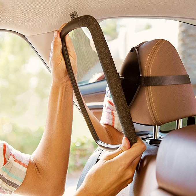 - Sturdy dual straps made of seatbelt material buckle onto adjustable headrests for secure attachment. Note: Mirror is compatible with adjustable headrests, but not with fixed headrests