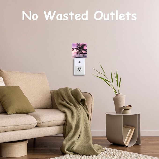 - Reliable Materials:Made of high-quality plastic and premium LED light source,the Purple Sunset with Palm Tree plug night light is durable and long-lasting.This plug-in night light,which is smaller than your hand,can be flexibly inserted into a socket for use.Its compact appearance saves space and does not affect the use of other devices