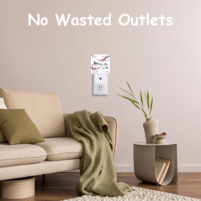 - Dusk to Dawn Sensor:This Cherry Blossom Lake and Hills night light plug wall is equipped with a light sensor that automatically turns on at dusk or dim light and turns off at dawn or when there is sufficient light.Its smart design saves power and eliminates the need for manual switching