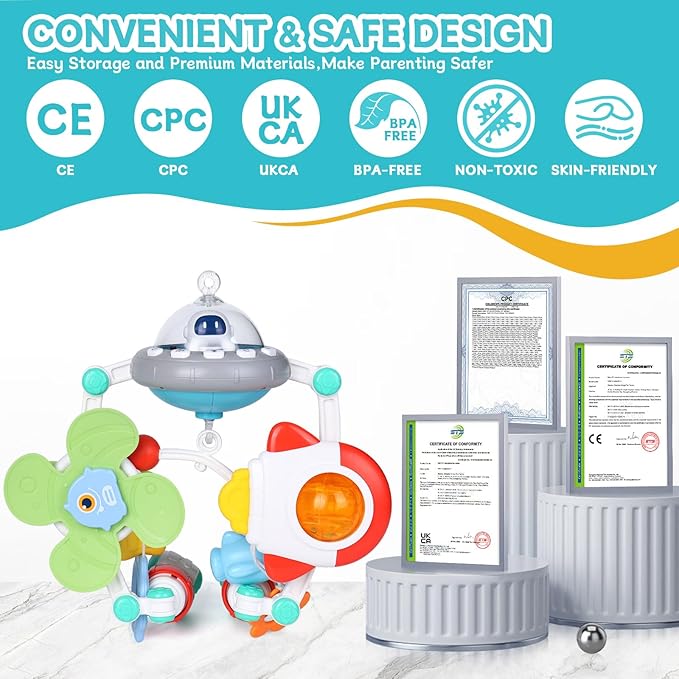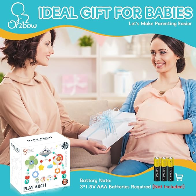 - SPACE-THEMED PLAY ARCH: Orzbow Baby Arch Stroller Toy boasts five playthings of alien spinning windmill toys, UFO motorized music box, rocket-shaped rattle teether, spinning pentagram and space shuttle toy.Cute design can captivate and delight babies