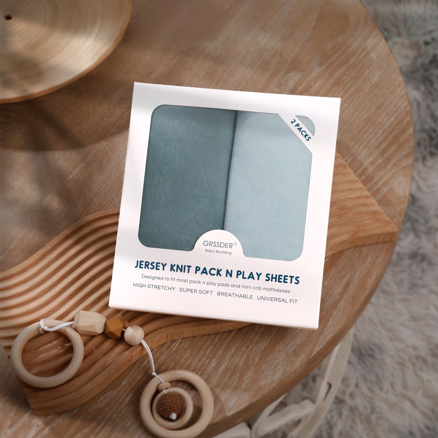 GRSSDER Mini Crib Sheets Fitted, Pack and Play Sheets 2 Pack, Ultra Soft Stretchy Pack N Play Sheets, Universal Fit for Playard Mattress, Jersey Crib Sheets Neutral for Boys and Girls, Blue