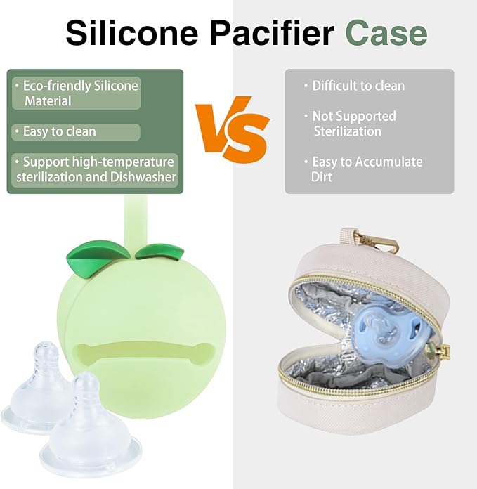 - Silicone Pacifier Case: 100% food-grade silicone, free of BPA, PVC and lead. Supports dishwasher, microwave and 120° high temperature for quick sterilization, It can hold 2-3 pacifiers, headphones etc, easily installed on diaper tote bags, and stroller.