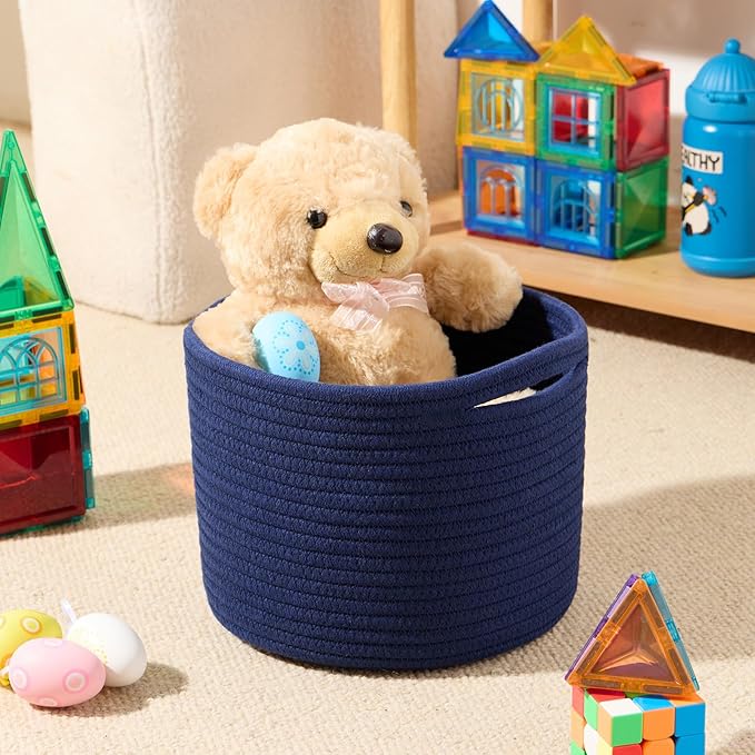 Small Basket for Organizing | Cube Shelf Closet Storage Baskets | 9.7×9.7×7.1” | Woven Rope Gift Basket | Nursery | Round 3 Packs Navy Blue